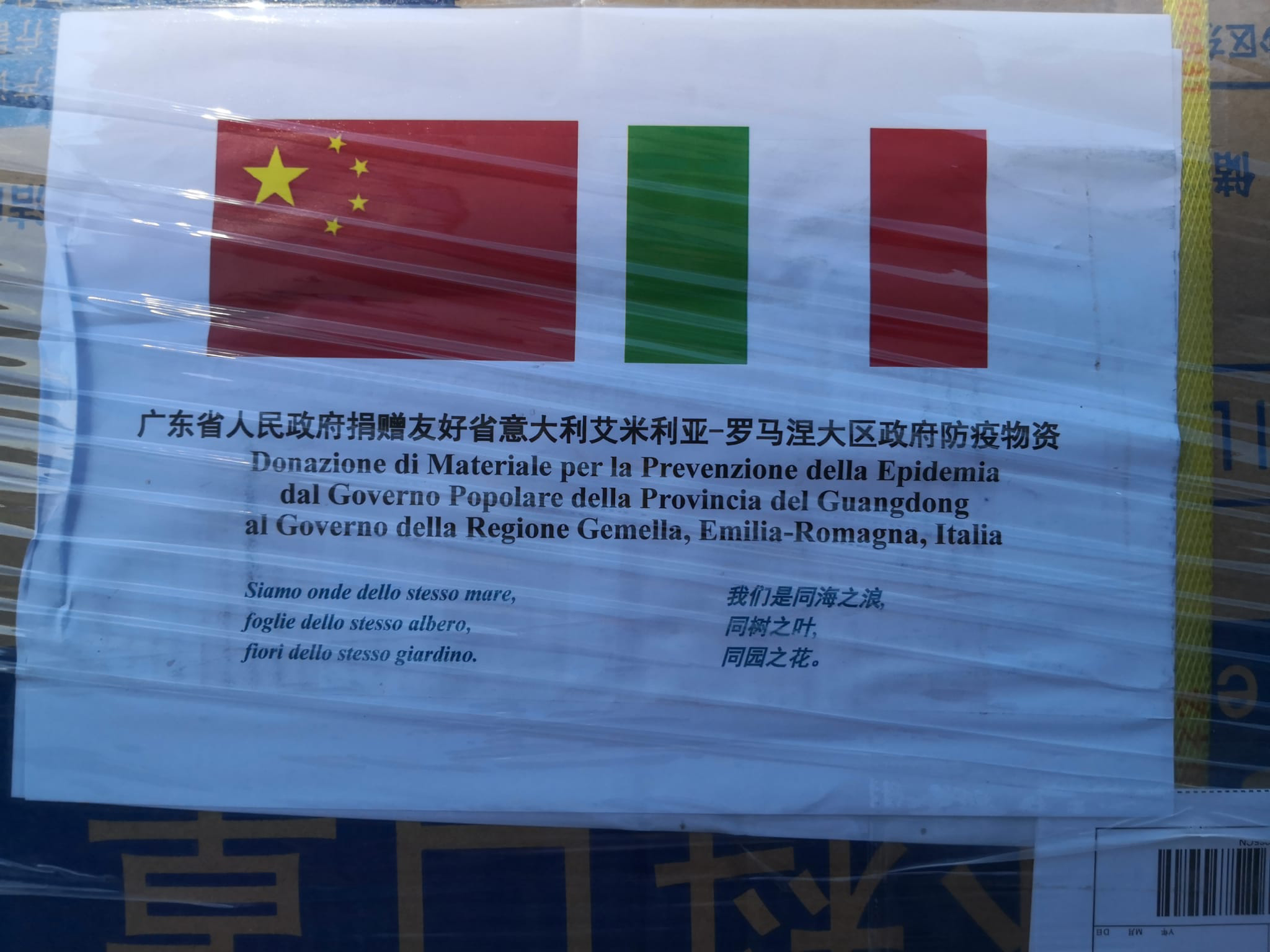 Bologna – “Siamo onde dello stesso mare, foglie dello stesso albero, fiori dello stesso giardino”. Questo il messaggio che accompagna il carico di 200 mila mascherine chirurgiche arrivate questa mattina per iniziativa del governatore della Provincia cinese del Guangdong, Ma Xingrui, territorio gemellato con la Regione Emilia-Romagna dal 2015, e che saranno subito consegnate al magazzino della sanità di Reggio Emilia. E altre 20 mila mascherine arriveranno dalla città di Heyuan, sempre della Provincia di Guangdong, gemellata con Ferrara.