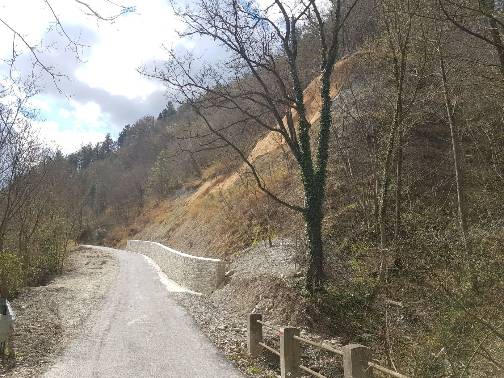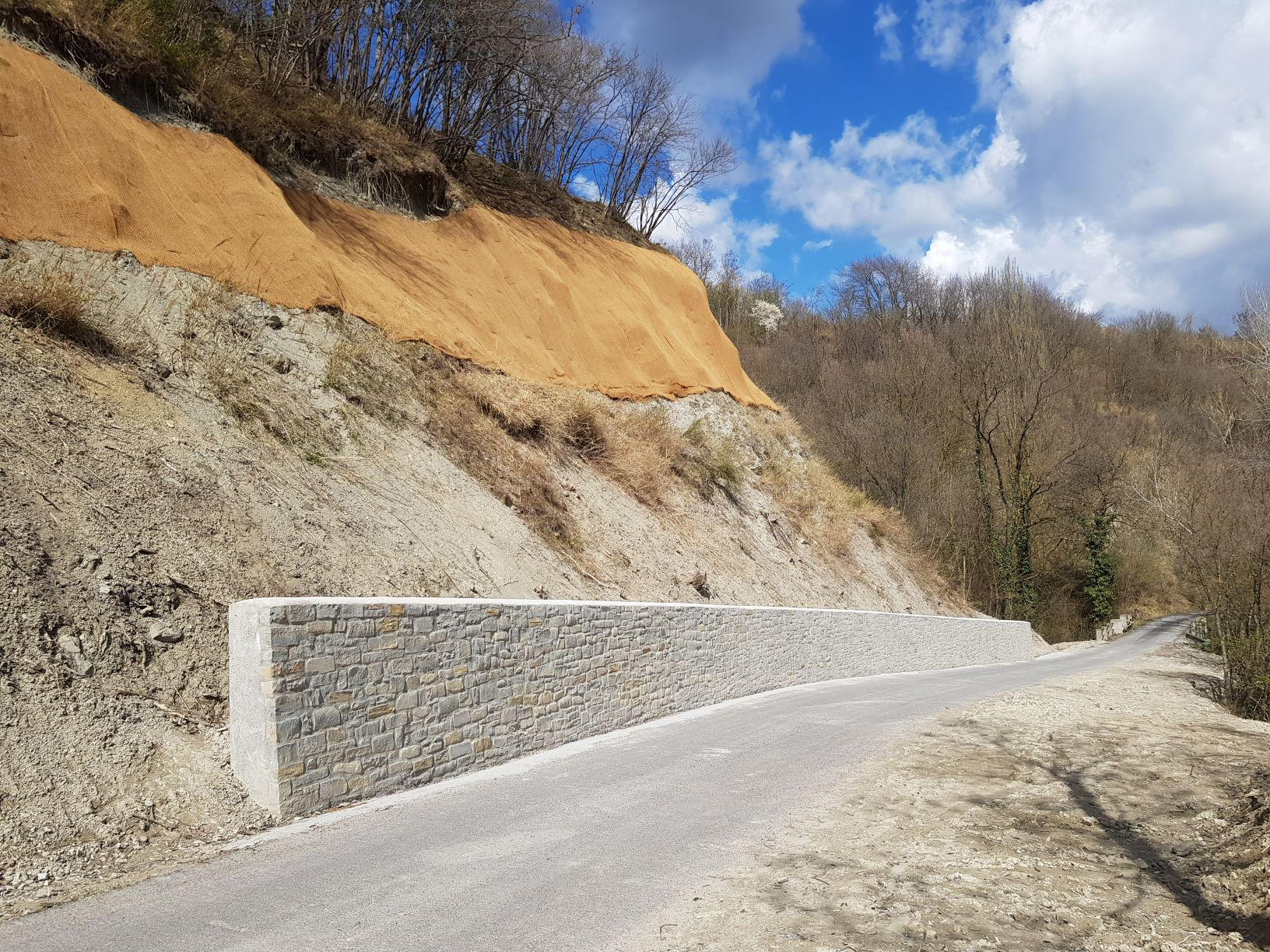 Più in dettaglio, alla base del pendio è stato realizzato un muro di contenimento in cemento armato rivestito in pietra nel rispetto della tutela paesaggistica. Inoltre, si è proceduto alla riprofilatura della scarpata con la rimozione del materiale instabile e la successiva posa di una biostuoia (tessuto naturale antierosione) per favorire il naturale ripristino del manto erboso.