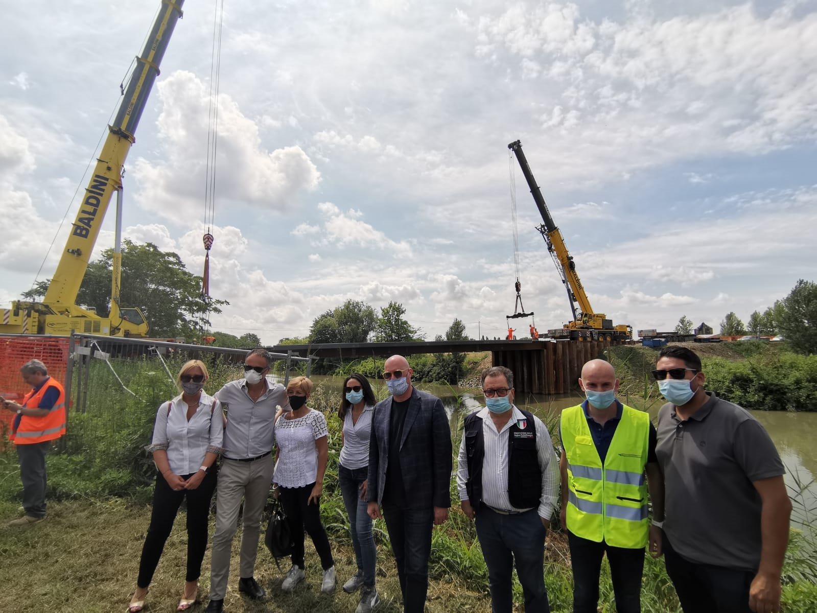 E oggi Bonaccini e gli assessori hanno assistito al varo del ponte provvisorio di Final di Rero di Tresignana, con il posizionamento della struttura orizzontale metallica (impalcato), che collega le due sponde del Po di Volano. L’opera ha un costo di 2 milioni di euro e consente anche ai mezzi più pesanti di attraversare in sicurezza il Po di Volano evitando allungamenti di percorso con aumento dell’inquinamento e dei rischi legati alla sicurezza del traffico