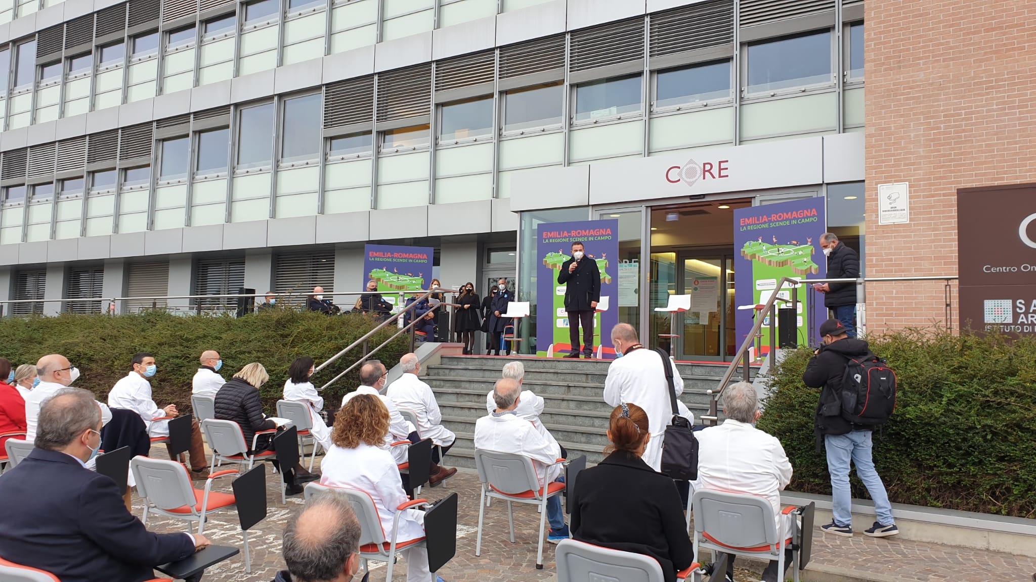 “Il Core è una delle grandi eccellenze sanitarie dell’Emilia-Romagna, una struttura dove i tumori si curano non solo facendo ricerca ma anche mettendo il paziente come persona al centro di un percorso, e il personale del Core, anche durante questa terribile pandemia, non ha mai smesso di fare il proprio lavoro al meglio delle proprie capacità e oltre- spiega Donini-. Ecco perché in questi giorni difficili, in cui abbiamo assistito anche a episodi inqualificabili contro medici e operatori sanitari, è importante la presenza qui di una delegazione degli Azzurri, la squadra di calcio intorno a cui tutti siamo abituati a stringerci senza distinzioni: grazie per tenere alta l’attenzione su chi si impegna ogni giorno in prima linea per la salute di tutti”.