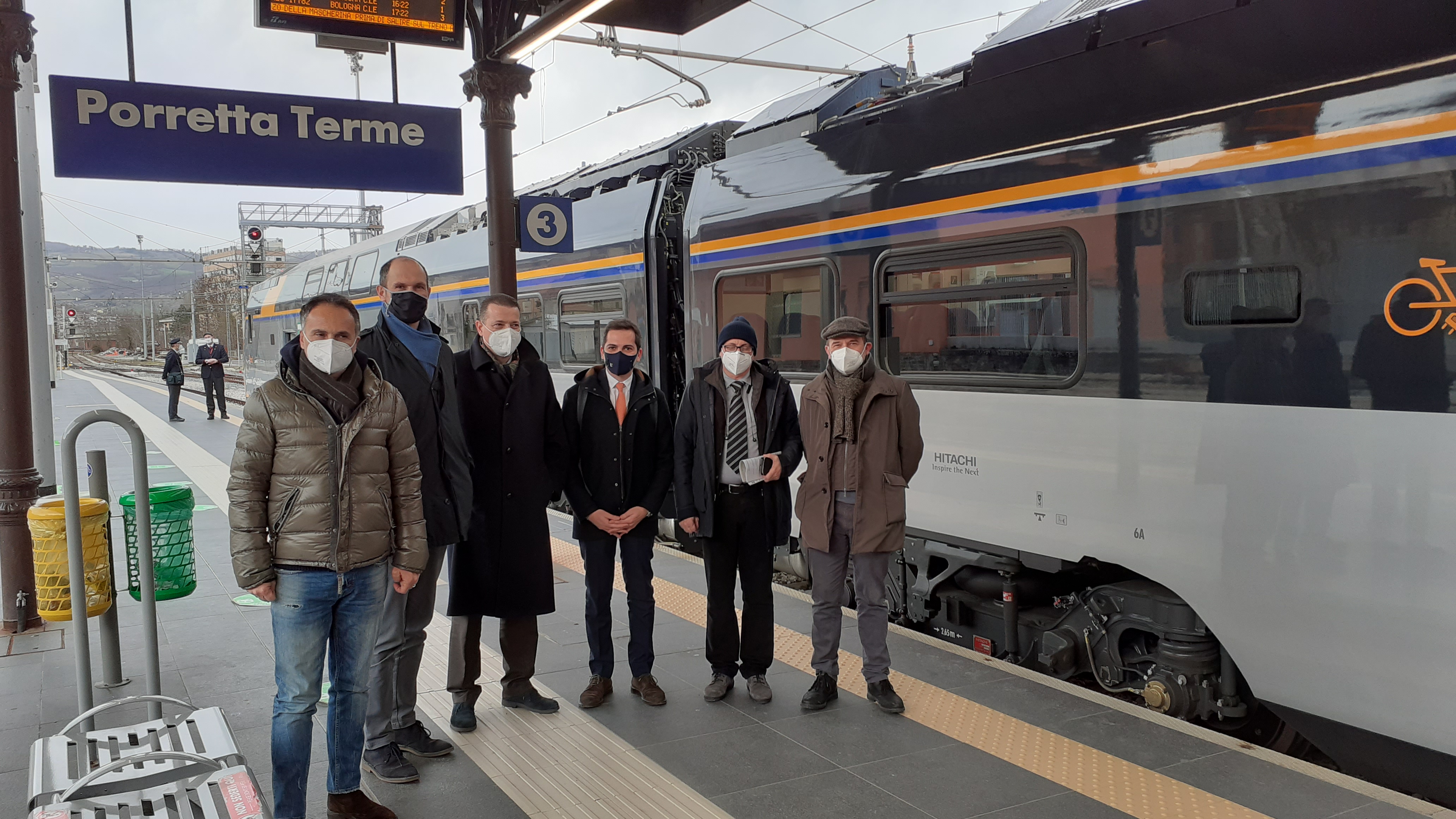 Nella altra foto, all’arrivo a Porretta Terme, da sinistra l’assessore Corsini, Tullio, Paolillo, il responsabile commerciale di Trenitalia-Tper Alessandro Botteghi e il presidente di Crufer e del Comitato pendolari Porrettana Valerio Giusti.