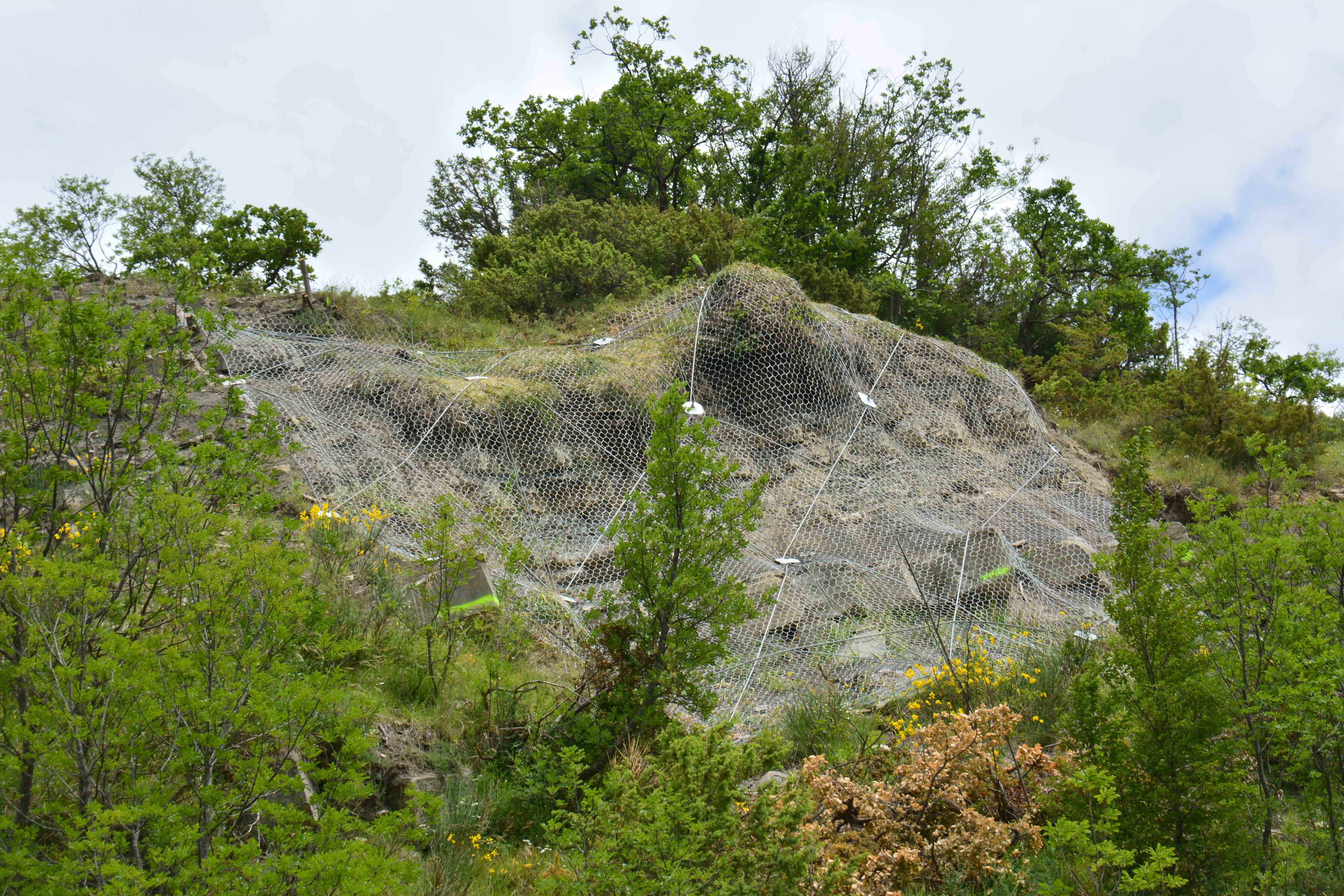 È stata poi posata una rete metallica, rafforzata a partire dalla sommità e per un lungo tratto della parete, con l’obiettivo di contrastare la caduta dei massi.