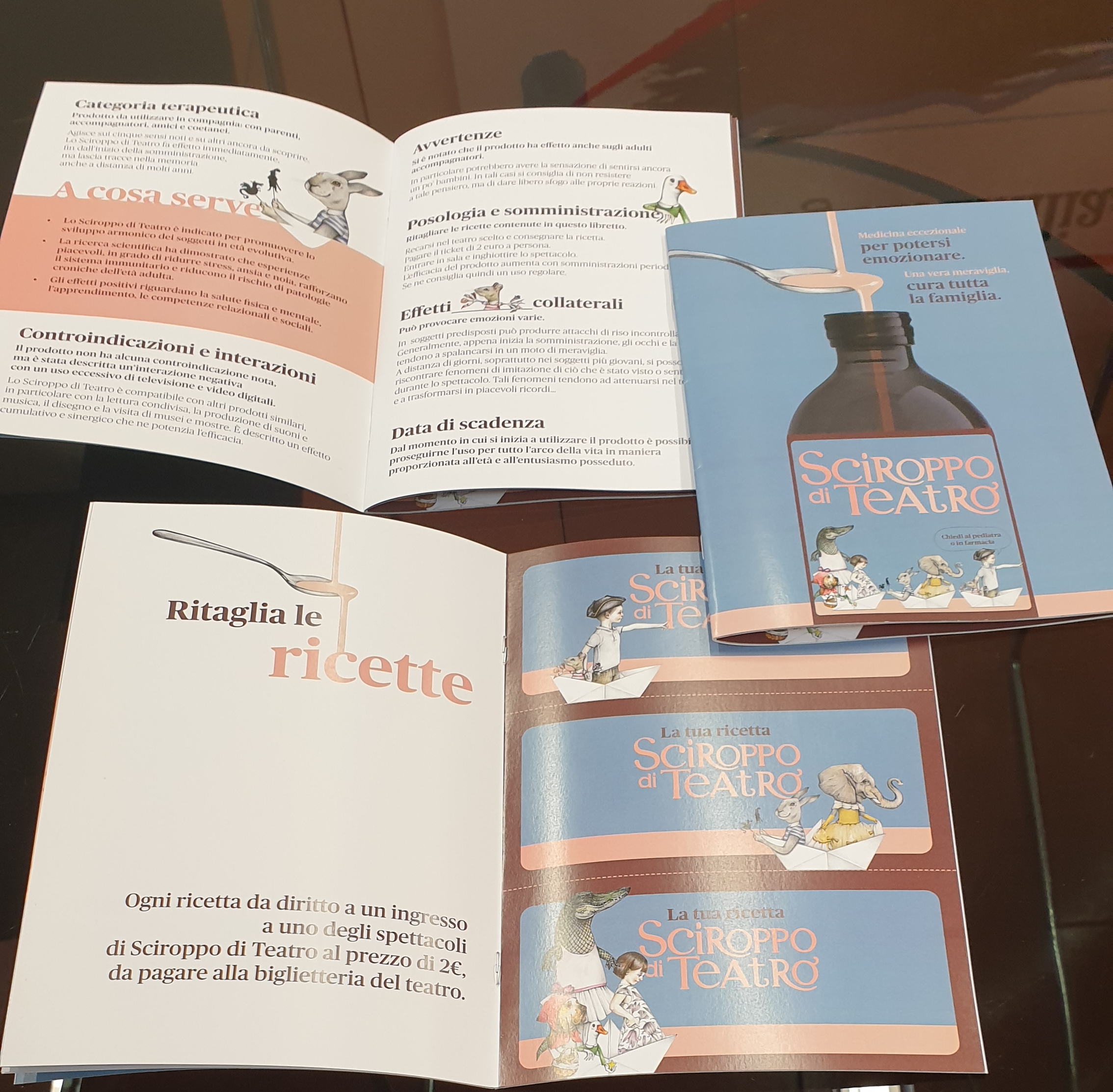 Lo sciroppo è in realtà un libretto, impreziosito dalle illustrazioni di Matteo Pagani, nel quale è inserito anche un bugiardino che contiene le indicazioni per la somministrazione e l’assunzione di questa straordinaria medicina: 3 “ricette”, ognuna delle quali corrisponde a un biglietto, al prezzo di 2 euro, per ogni bambino e per ciascun accompagnatore, che potranno assistere in questo modo alla stagione di 3 spettacoli di Teatro ragazzi in programma da metà gennaio nei 21 teatri dei comuni che aderiscono alla rete, 12 dei quali sono gestiti direttamente da Ater.