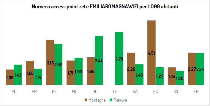 I 10mila punti wi-fi attualmente presenti in Emilia-Romagna sono così suddivisi, per provincia: 3.271 a Bologna (di cui il 9% in montagna),1.547 a Reggio Emilia (9% in montagna), 1.332 a Modena (9% in montagna anche qui), 1.270 a Ferrara (qui ovviamente non ci sono Comuni montani), 706 a Forlì-Cesena (41% in montagna), 578 a Ravenna (il 6% in montagna), 548 a Parma (18% in montagna), 401 a Piacenza (6% in montagna), 347 a Rimini (in montagna il 12%).