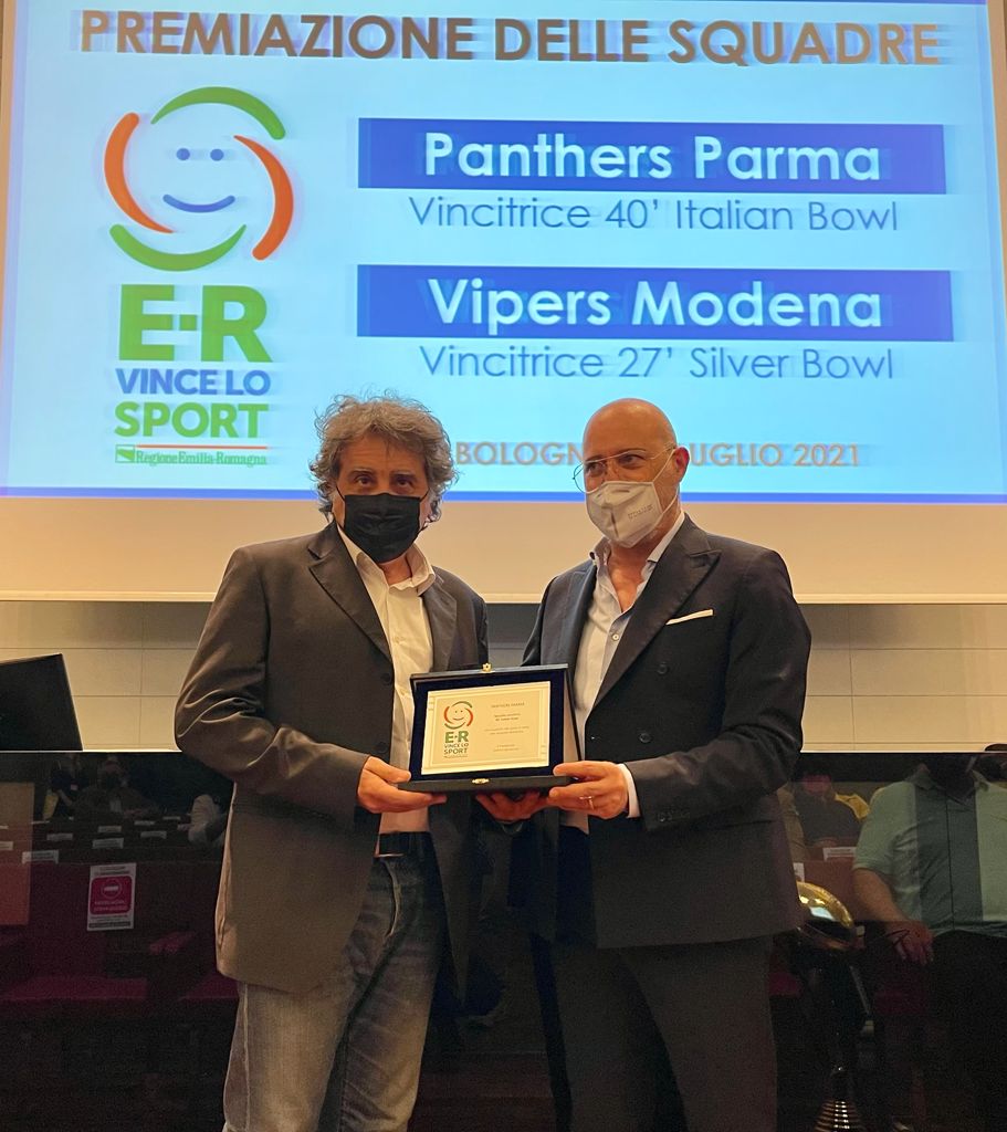 Bologna – I Panthers Parma appena laureati campioni d'Italia in prima divisione, conquistano il loro quinto scudetto. Un traguardo importante, che anche il presidente Stefano Bonaccini ha inteso riconoscere. Oggi, a ritirare la targa, in Regione a Bologna, il presidente della società parmense, Ugo Bonvicini, il vicepresidente, Alberto Agnetti, il dirigente Valentina Gianferrari, e i giocatori Alessandro Malpeli, capitano, e Tommaso Finadri, eletto miglior giocatore della finale, in rappresentanza dei tutti i compagni di squadra. Presente anche Giammaria Manghi, capo della segreteria politica della Presidenza della Regione e il vicepresidente della Federazione italiana Football americano, Francesco Cerra.