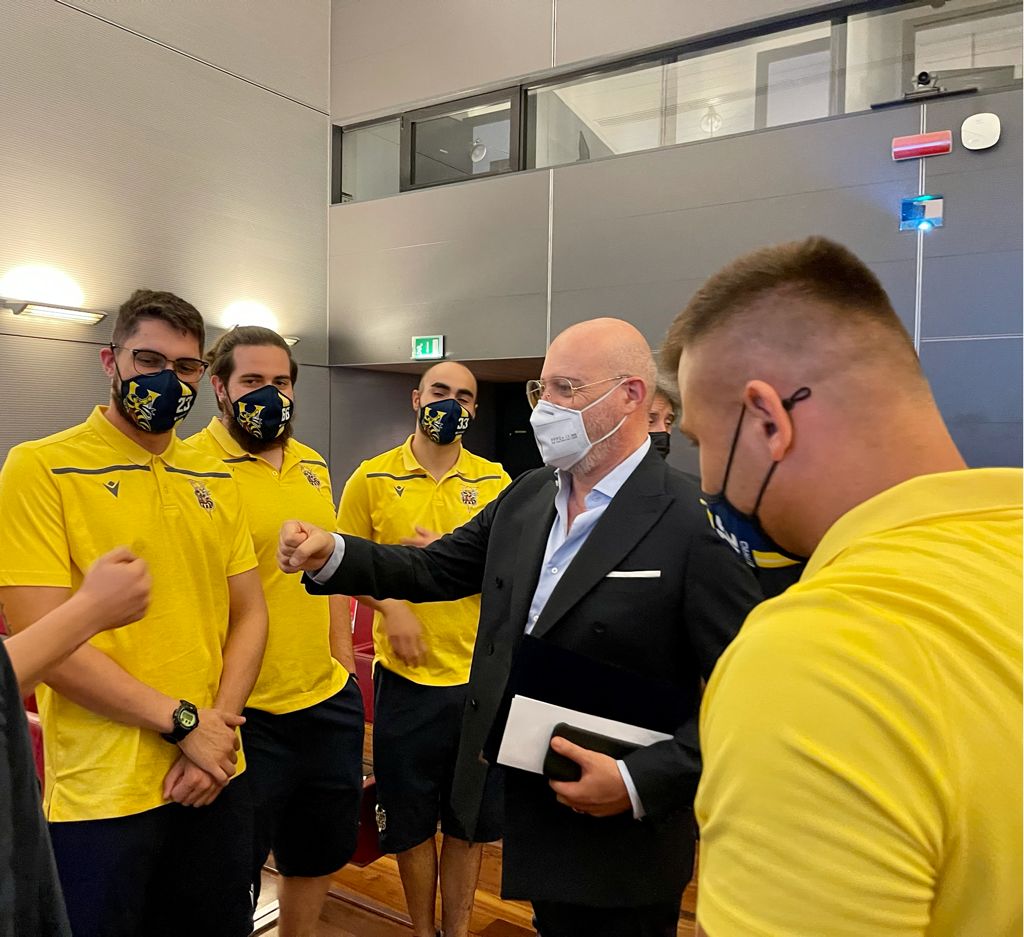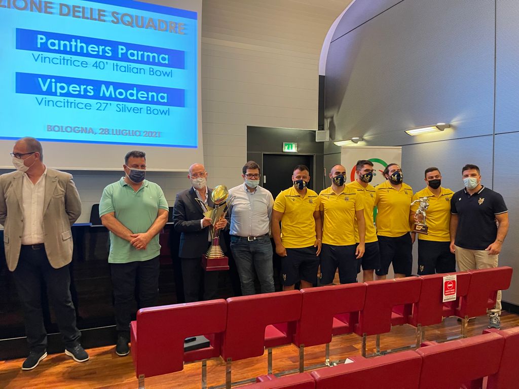 Bologna – Dopo due anni di assenza forzata a causa della sospensione dei campionati dovuta alla pandemia, i Vipers Modena si aggiudicano il 27^ Silver Bowl, la finale del Campionato Italiano di Seconda Divisione di Football americano. Nella finale play off di metà luglio, giocata allo stadio Garilli di Piacenza, hanno avuto la meglio sui Giaguari Torino per 41 a 14. Un traguardo importante, che anche il presidente Stefano Bonaccini ha voluto riconoscere. Oggi, a ritirare la targa, in Regione a Bologna, il presidente della società modenese, Pietro Montaruli, il vicepresidente, Christian Caleffi, la dirigente Inna Berezanskaya, Angelo Piccolella, Team Manager e delegato FIDAF, Christian Nobile, Head Coach, e i giocatori Myrteza Vrapi, Riccardo Gambuzzi, Alessandro Bigliardi, Umberto Barile e Enrico Goldoni, votato dalla tribuna stampa MVP (Most Valuable Player) della partita finale. Presente anche Giammaria Manghi, capo della segreteria politica della Presidenza della Regione e l’assessora del Comune di Modena, Grazia Baracchi, insieme alla responsabile dell'Ufficio Sport, Giovanna Rondinone, e il vicepresidente della Federazione italiana Football americano, Francesco Cerra.