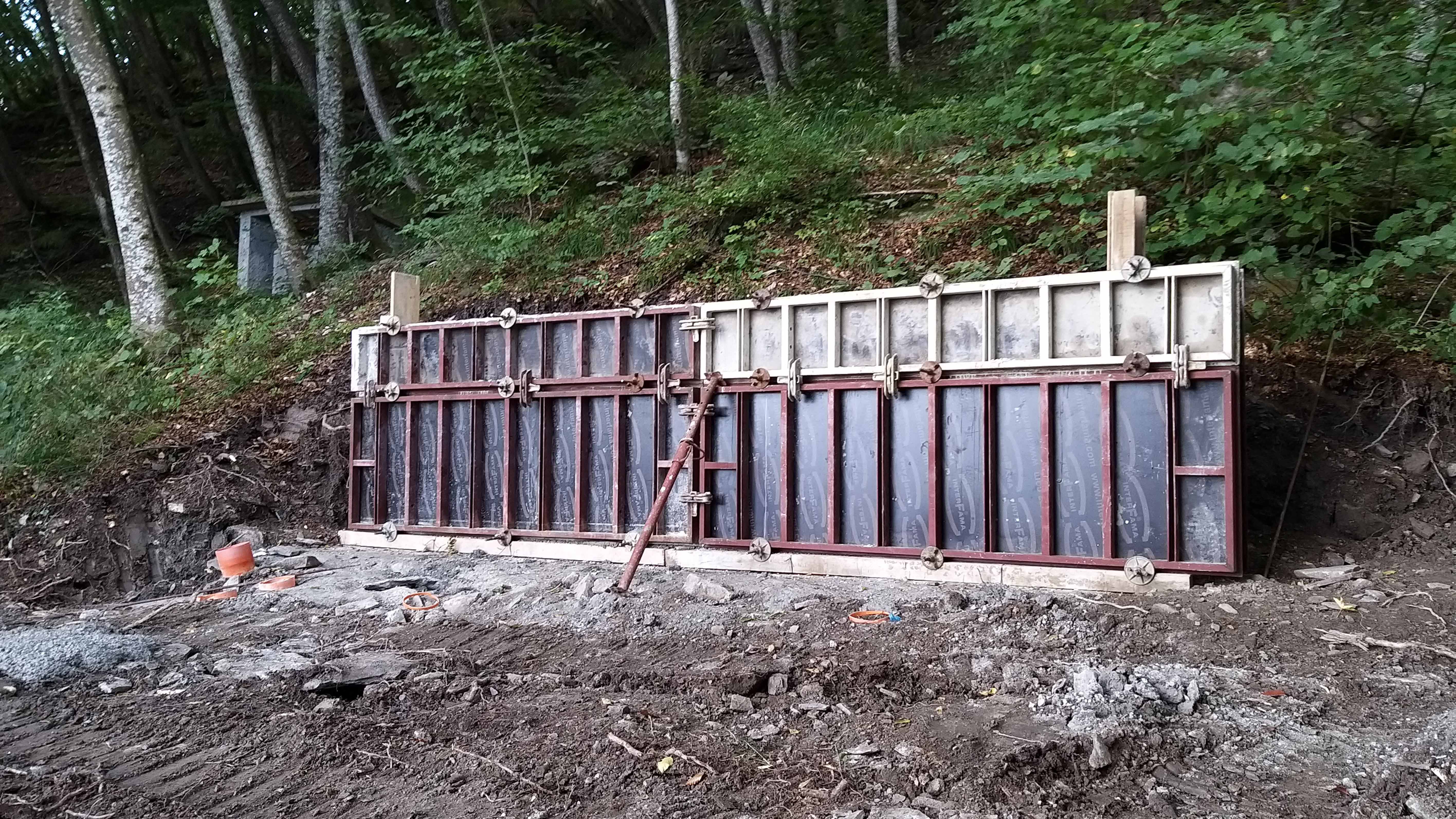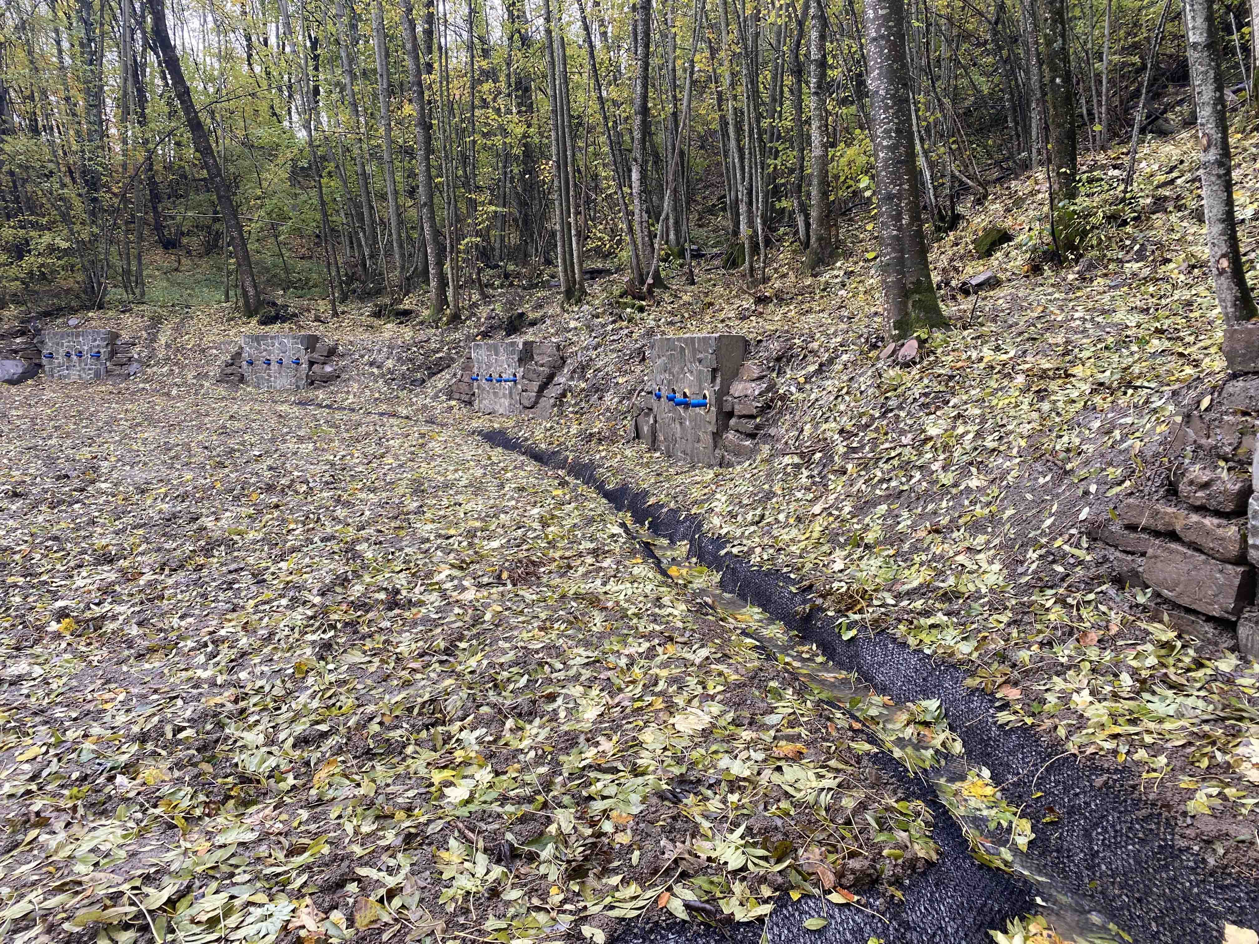 Attualmente è in corso la costruzione della prima delle due opere di sostegno in micropali con tiranti che serviranno a consolidare il versante in prossimità dei tratti di strada danneggiati dalla frana.