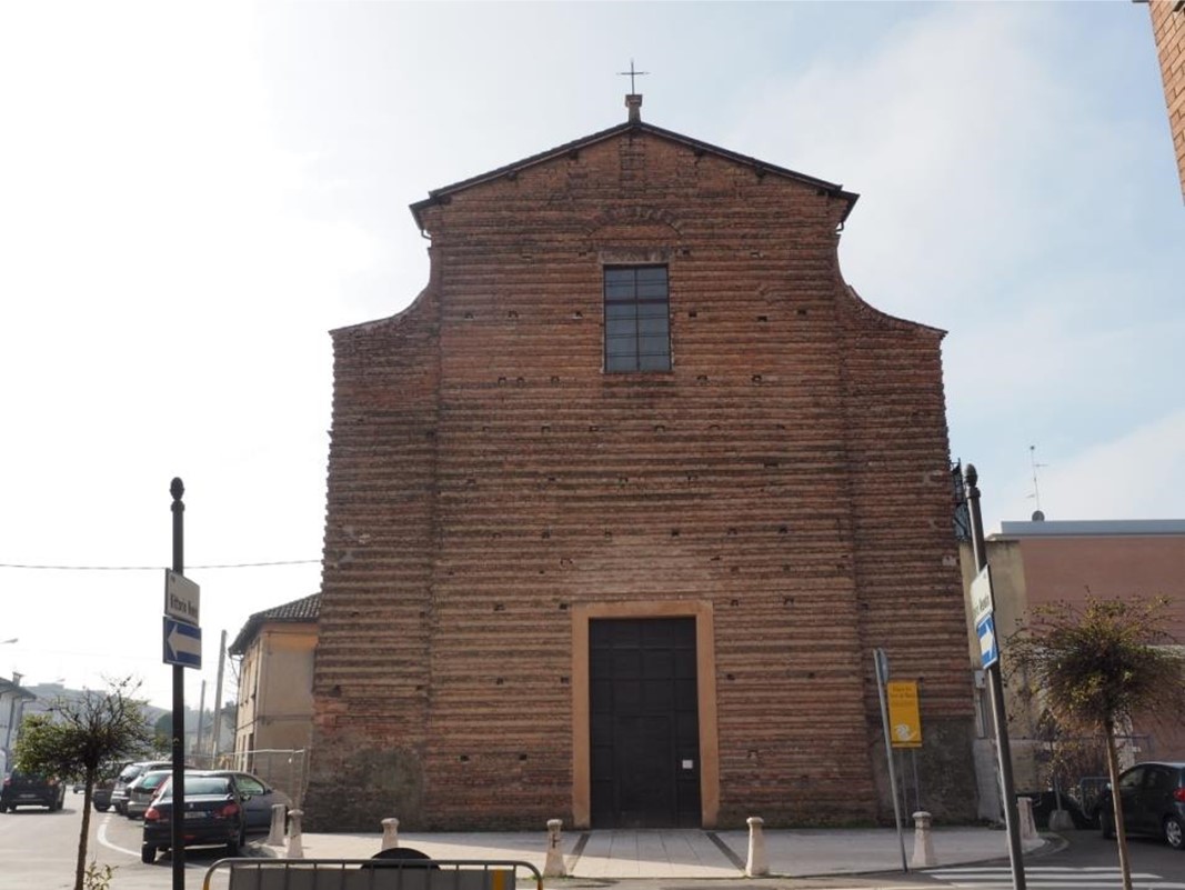 La Chiesa dei Servi di Maria, in stile barocco ad una sola navata e tre cappelle laterali per parte, fu consacrata il 24 maggio del 1674 e venne dedicata a S. Giovanni Battista e S. Filippo Benizzi. Nel 166 il Duca di Modena Francesco III d’Este soppresse il convento, che era edificato a lato della chiesa (ora abbattuto) e pose la chiesa ed i relativi arredi in vendita. Chiesa ed arredi vennero acquistati in blocco, per 100 zecchini, dalla Confraternita del Carmine di Novellara, che vi trasferì anche la statua della Madonna, fino ad allora conservata nell’Oratorio adiacente la Chiesa Collegiata. Con il Decreto napoleonico dell’aprile 1808, che ordinava la chiusura di tutte le chiese delle città, ad eccezione delle parrocchiali, iniziarono varie peripezie per la chiesa che finì col diventare sussidiaria della Collegiata di S. Stefano. Nel tempo l’edificio ha conservato il suo impianto originario, tranne la prima cappella di sinistra che ha subito varie trasformazioni. La sagrestia è posta sul lato est. Sul lato opposto è situata invece la torre campanaria./CL