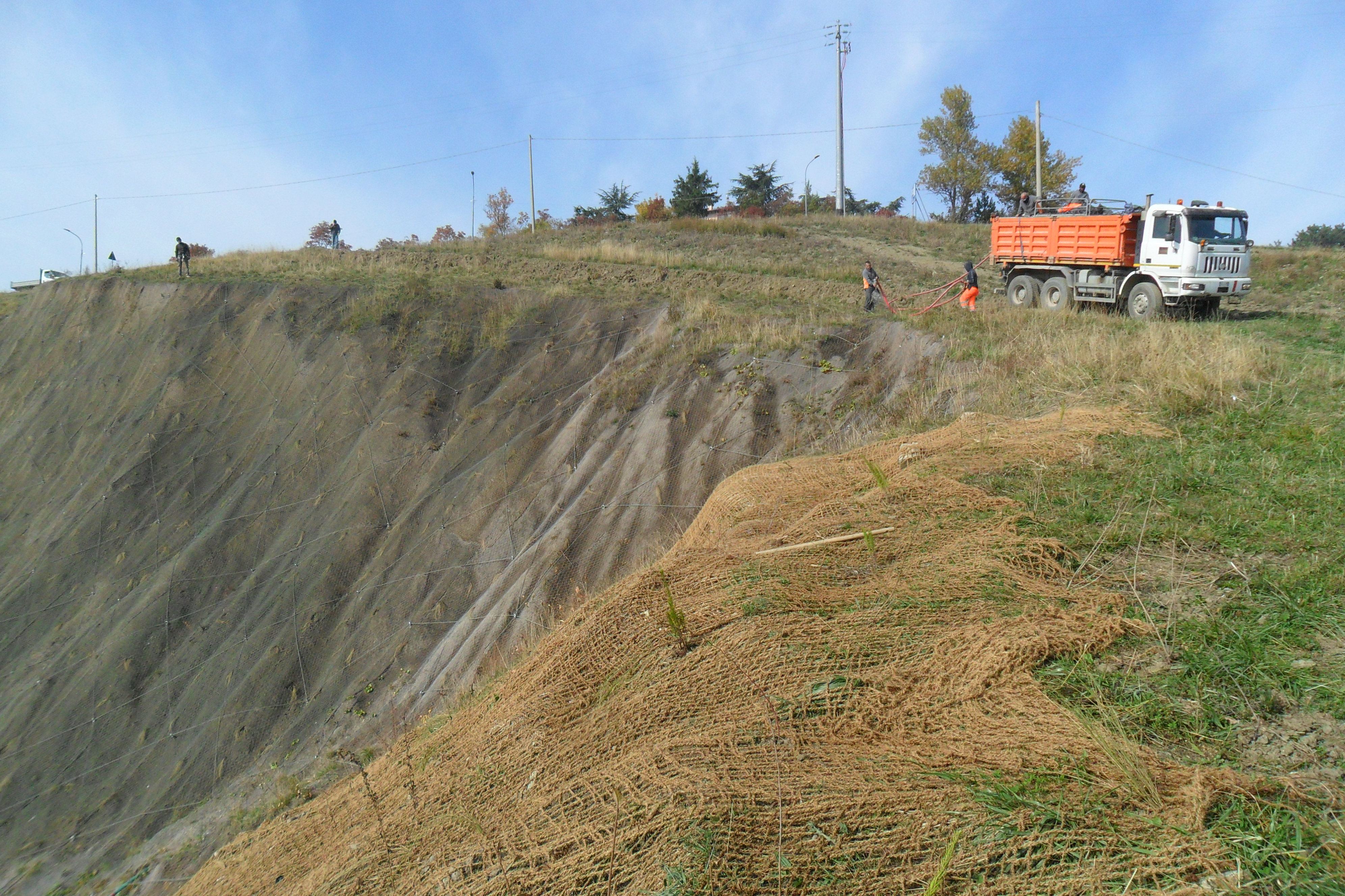 La scarpata principale del versante, soggetta a erosione progressiva, è stata inoltre protetta con un rivestimento in reti metalliche accoppiate a bio-reti antierosione in fibre naturali, fissate alle pareti con funi di acciaio.