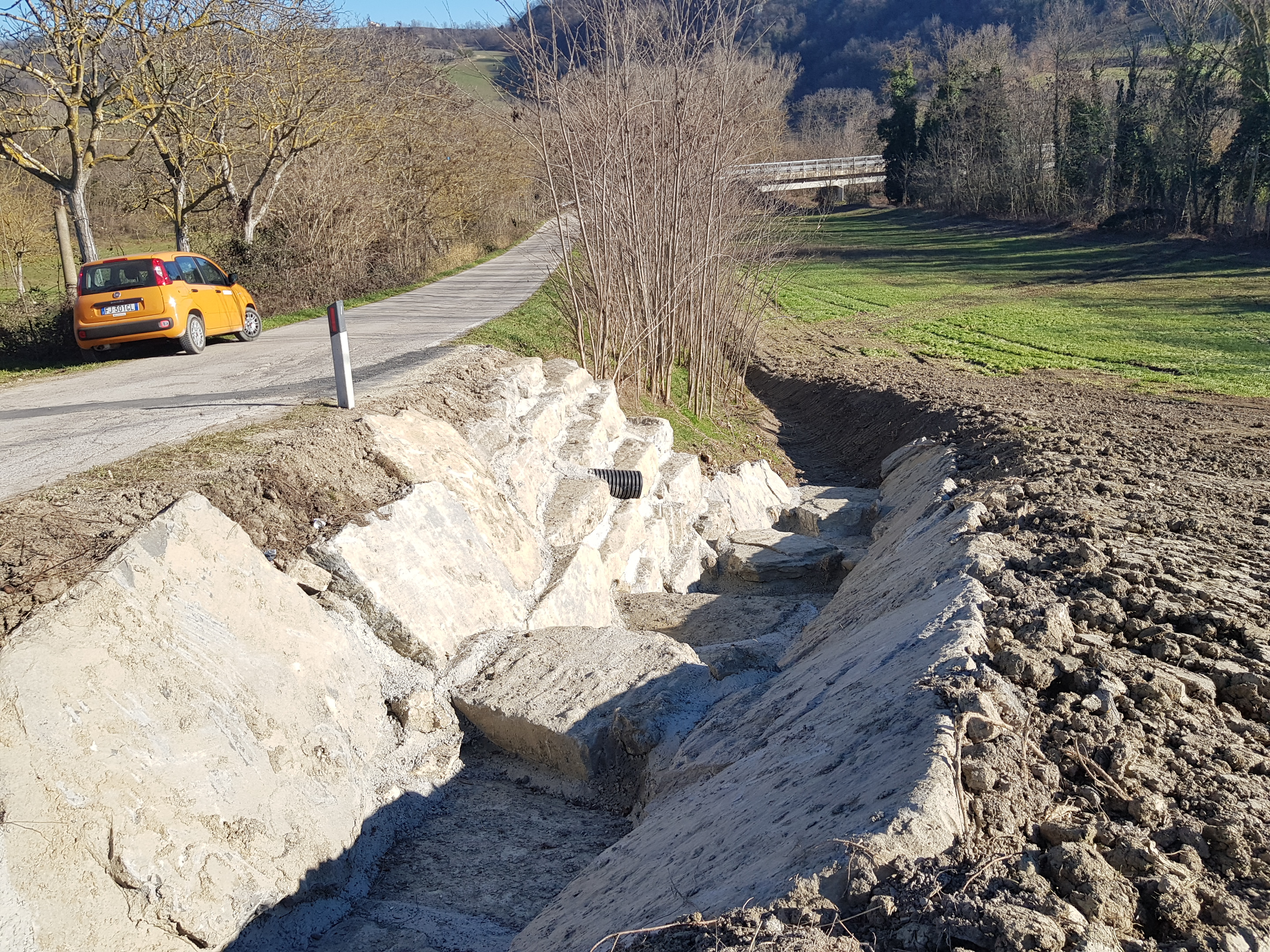 Per mettere l’arteria in sicurezza, si sono svolti lavori che hanno permesso di migliorare la regolazione delle acque superficiali, riprofilando il fosso stradale e sostituendo le tubazioni ammalorate. È stata inoltre consolidata la scarpata di valle che sostiene la banchina, realizzando una scogliera di massi nel tratto caratterizzato dal dissesto.