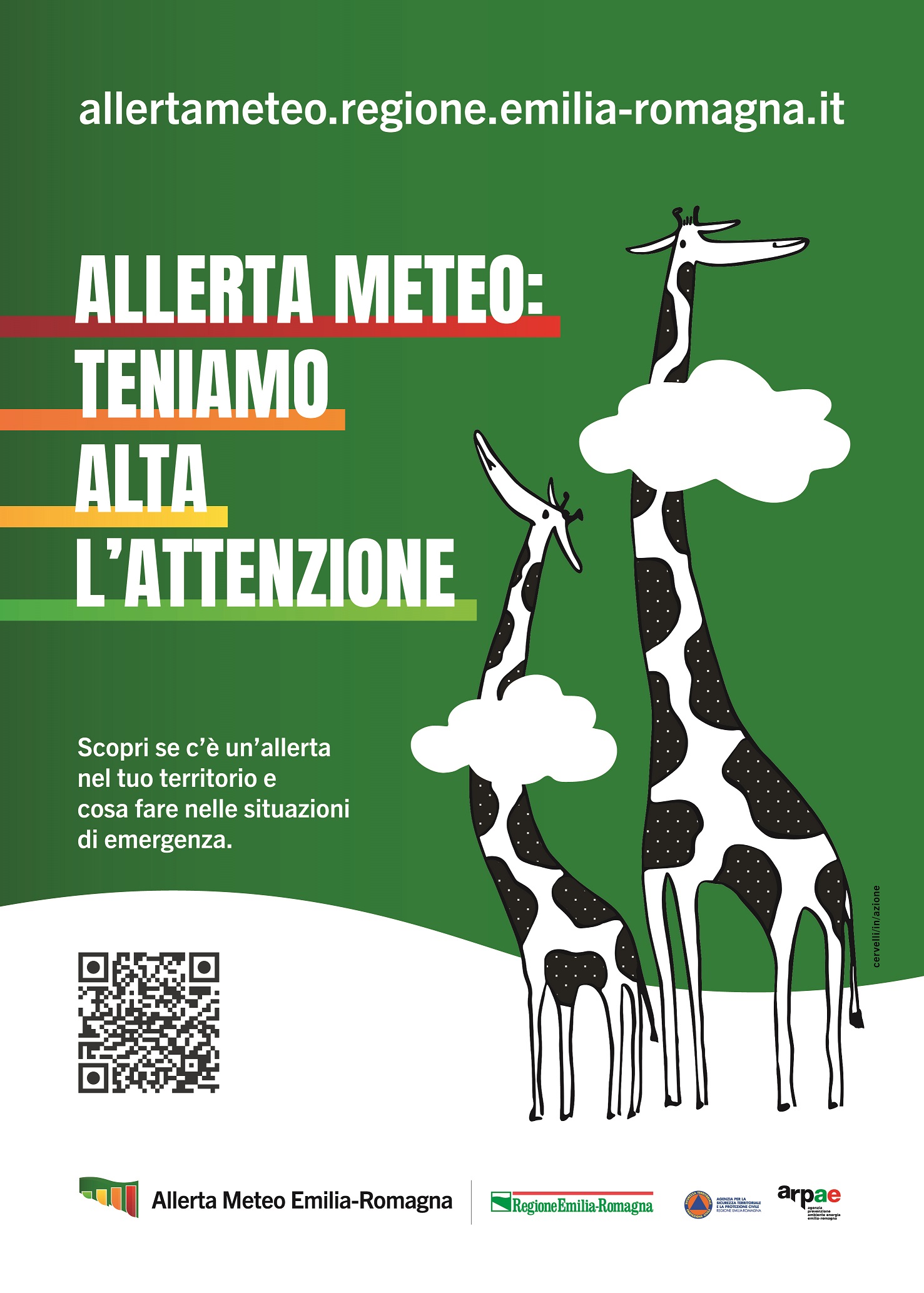 Protagoniste due giraffe che con il messaggio “Teniamo alta l’attenzione” invitano, inquadrando il qrcode col proprio smartphone, a collegarsi al portale AllertaMeteoER, il canale più affidabile per sapere ogni giorno con tempestività se in Emilia-Romagna è in corso un’allerta e il suo grado di gravità: verde, gialla, arancione o rossa.