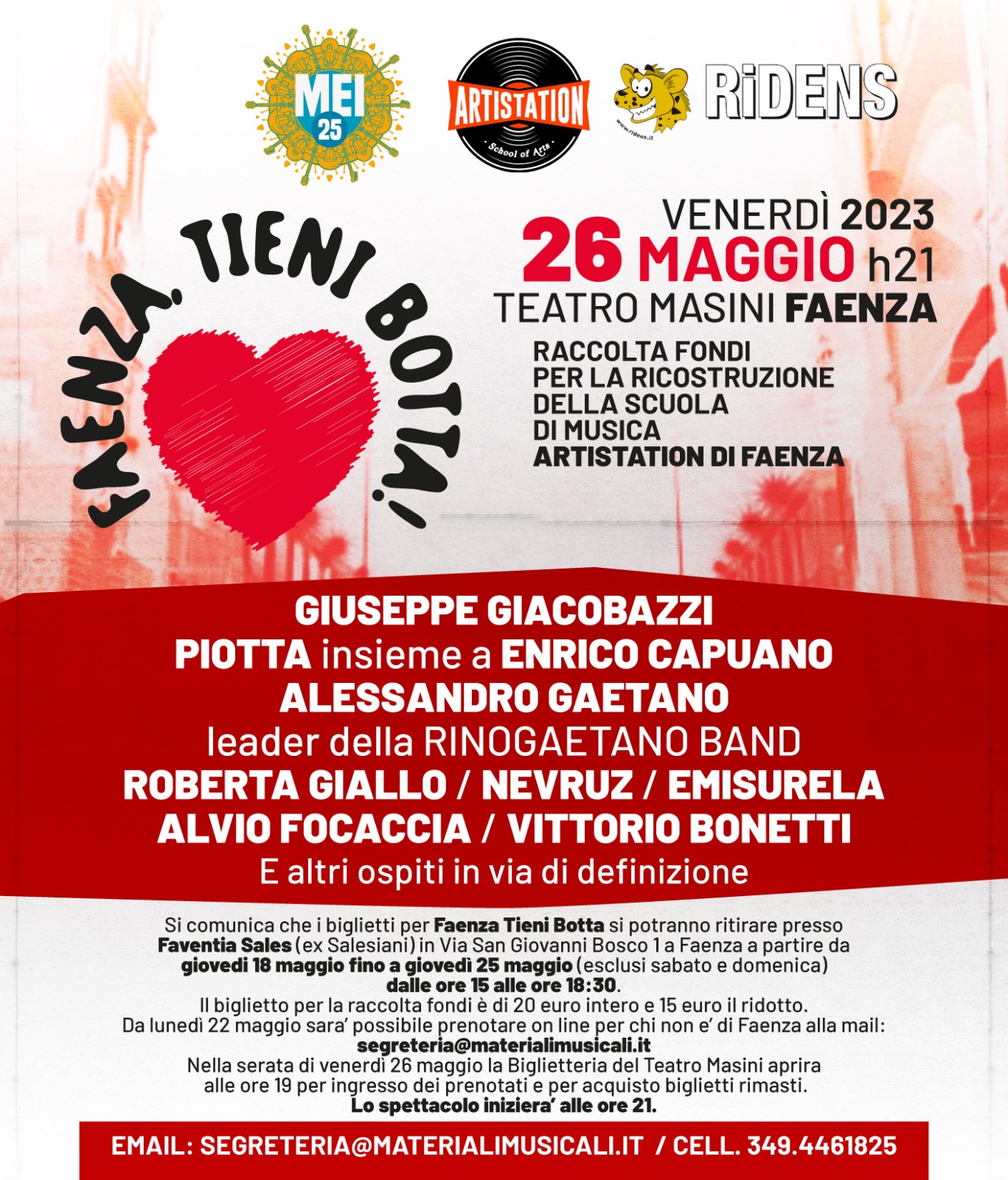 Domani, venerdì 26 maggio alle ore 21, il Teatro Masini di Faenza (piazza Nenni, 3) ospita “Faenza, tieni botta!”, una serata che mette insieme la musica e la comicità dei più noti artisti romagnoli a sostegno della comunità faentina colpita dall’alluvione. Uno spettacolo all’insegna della solidarietà promosso da due realtà della città ravennate: il Mei, la kermesse di musica indipendente, e Ridens, agenzia dei comici, insieme ad Artistation, la scuola di musica distrutta dall'alluvione.