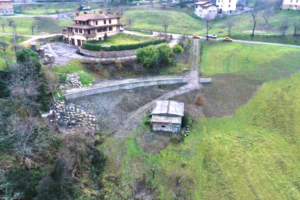 In particolare, si è realizzata una struttura di contenimento a salvaguardia delle abitazioni costituita da una paratia di pali trivellati con tiranti e un muro, oltre a un sistema di drenaggio profondo con pozzi ispezionabili.