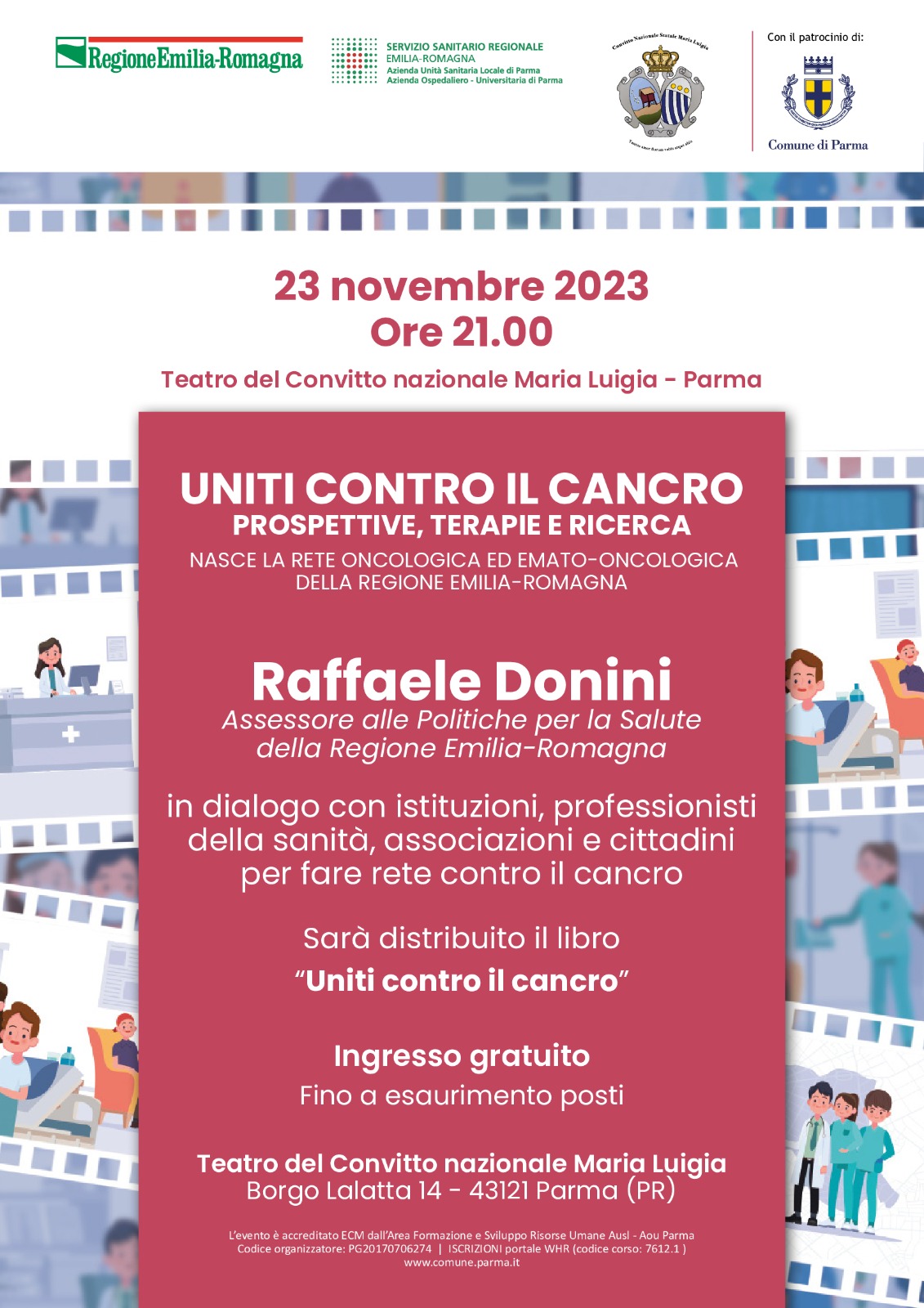 L’evento è accreditato ECM dall’Area Formazione e Sviluppo Risorse Umane dell’Ausl - AOU di Parma; se i professionisti desiderano i crediti, devono iscriversi sulla piattaforma WHR, codice corso 7612.1.