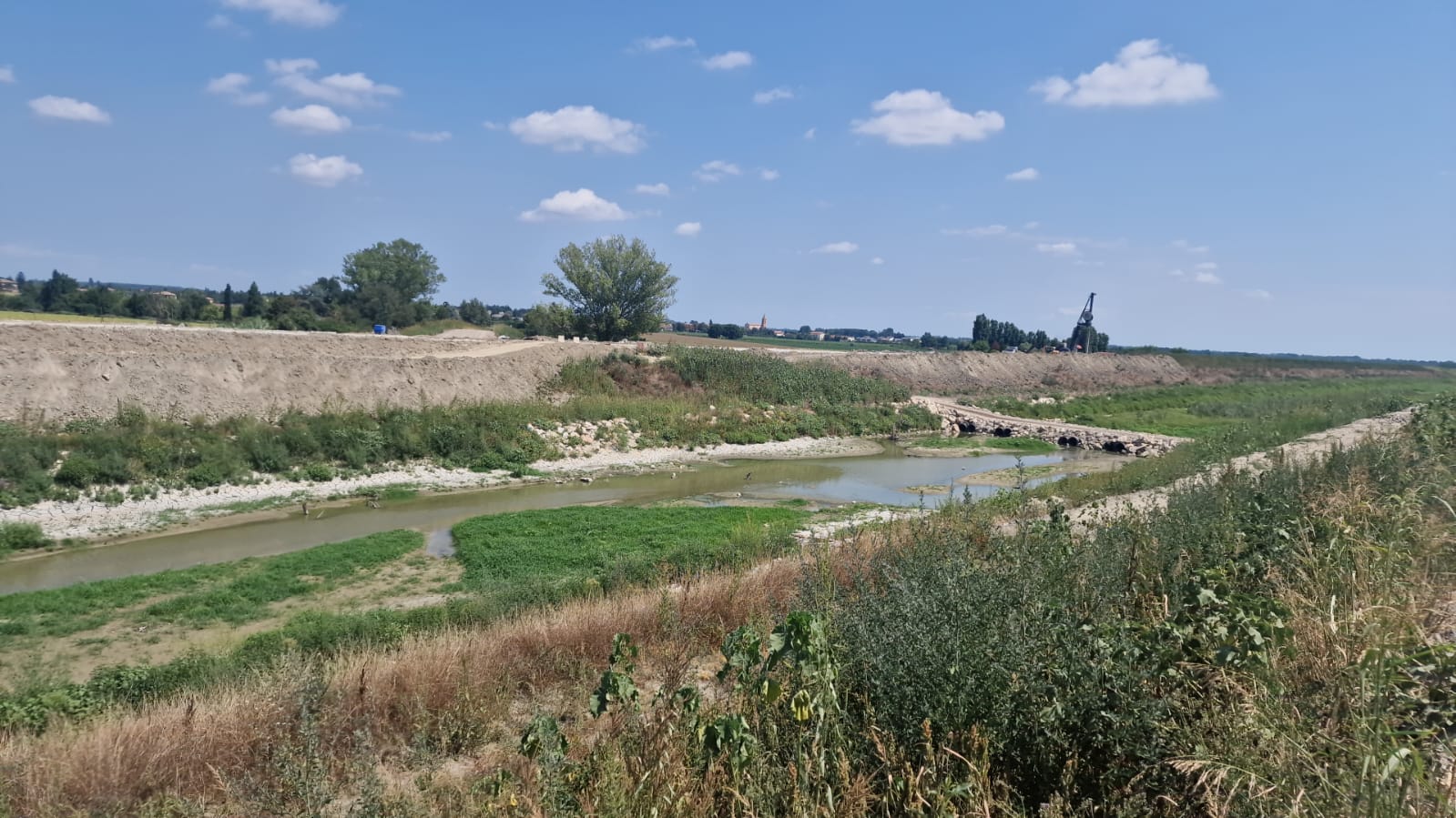 Per quanto riguarda il secondo intervento, la ricostruzione degli argini in destra e sinistra idraulica ha già superato ovunque la seconda banca arginale. I lavori stanno continuando con diaframmature plastiche, che servono a impermeabilizzare gli argini e proteggere le parti non ricostruite e parzialmente danneggiate. Sono in corso operazioni per realizzare le sommità degli argini di entrambe le sponde e portare le quote a quelle originarie. Il completamento dei lavori, a oggi, è previsto entro inizio ottobre.