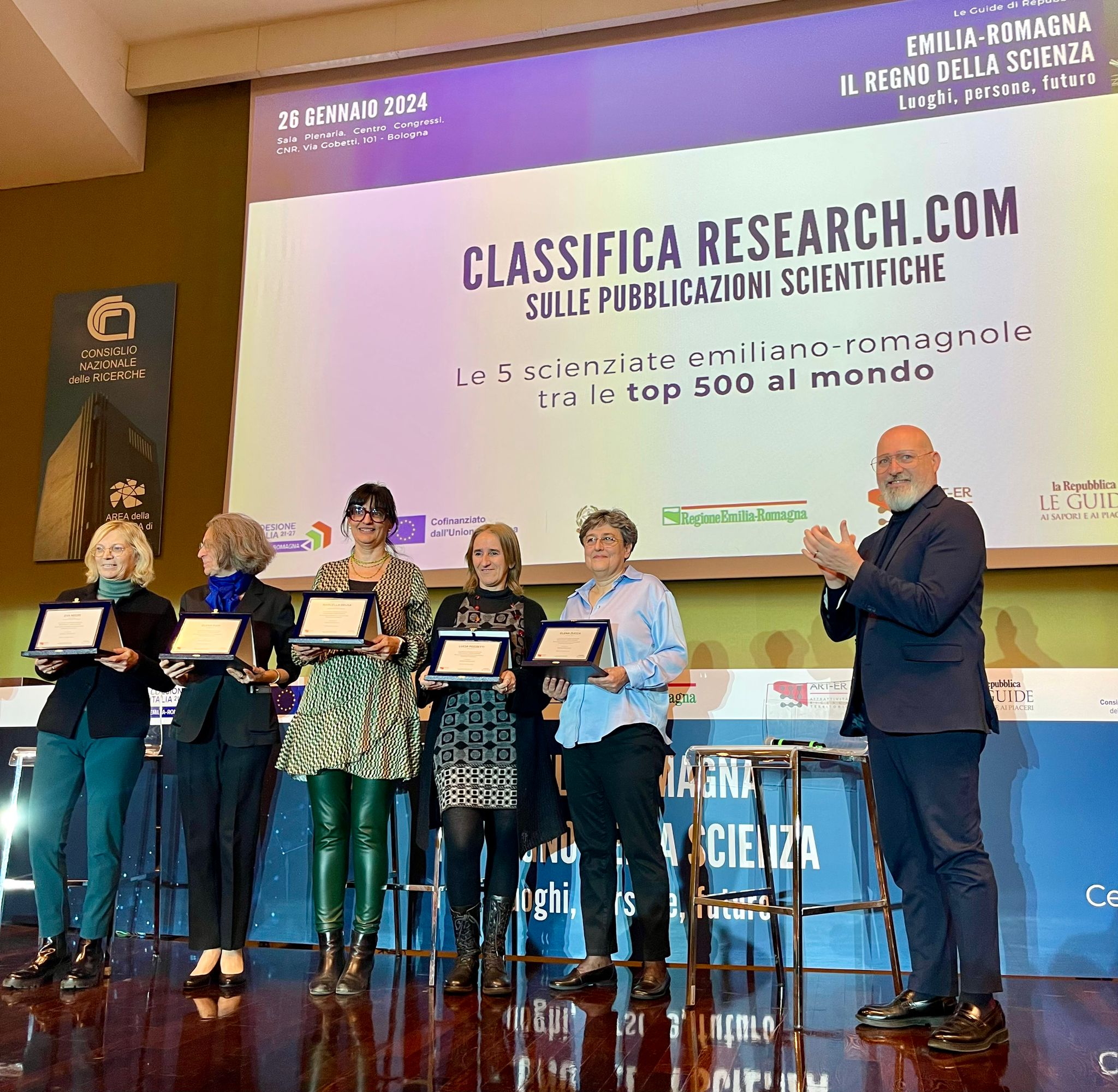 Sono Eva Negri, epidemiologa, e le quattro astrofisiche Lucia Pozzetti, Marcella Brusa, Elena Pian ed Elena Zucca: oggi hanno ricevuto dal presidente della Regione, Stefano Bonaccini, un riconoscimento per gli eccellenti risultati raggiunti nei rispettivi ambiti di ricerca. La consegna è avvenuta nell’Auditorium del Cnr di Bologna, contestualmente alla presentazione della guida “Emilia-Romagna, il regno della scienza. Luoghi, persone, futuro”, edita dal quotidiano la Repubblica in collaborazione con la Regione Emilia-Romagna.