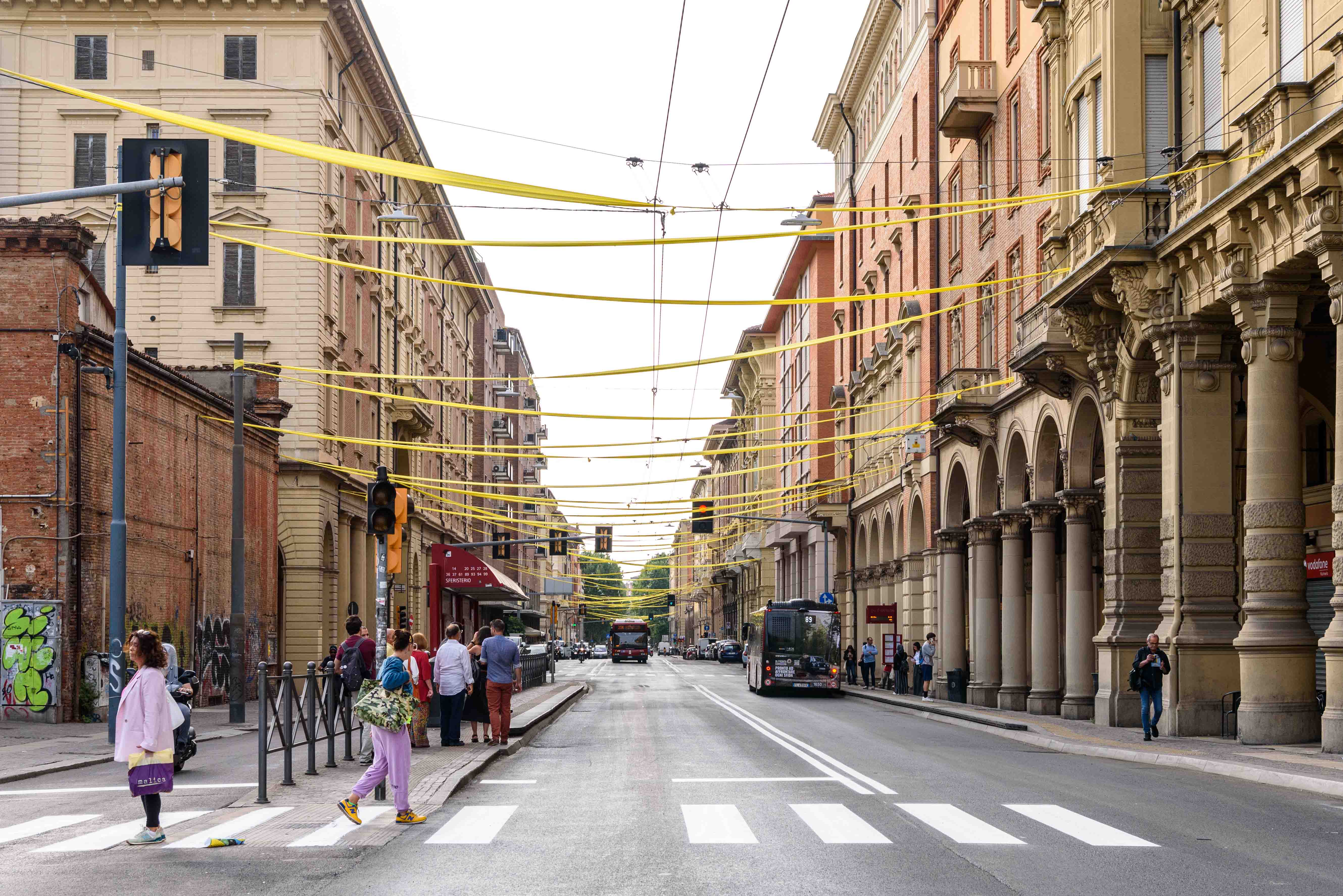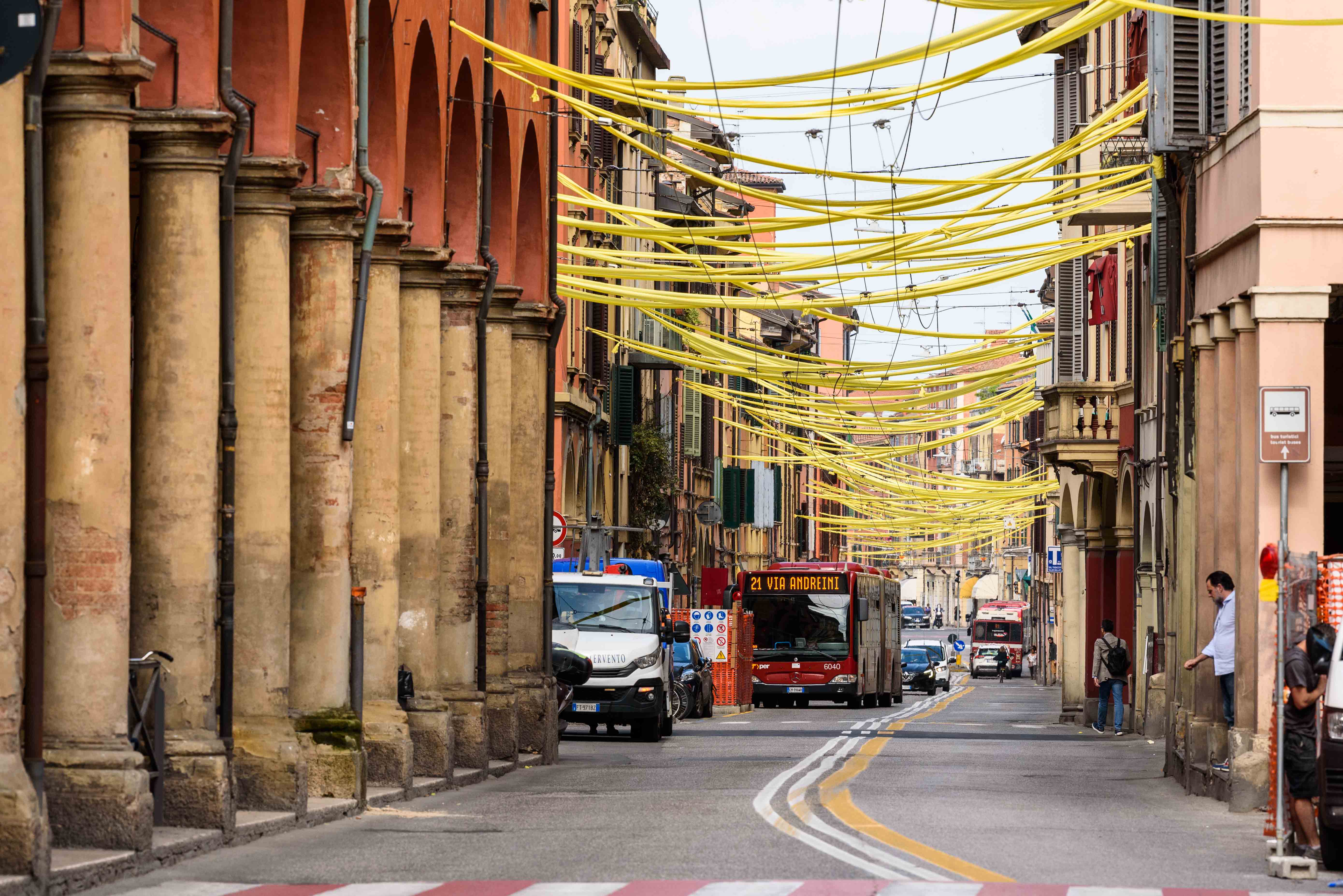 E per salutare l’arrivo del Tour, Bologna si è vestita a festa. Sono 16 i chilometri di tessuto con cui in questi giorni sono state addobbate le strade cittadine lungo il percorso: luminosi nastri gialli fissati fra i palazzi, fra gli alberi, sui balconi, alle finestre, sotto i portici.