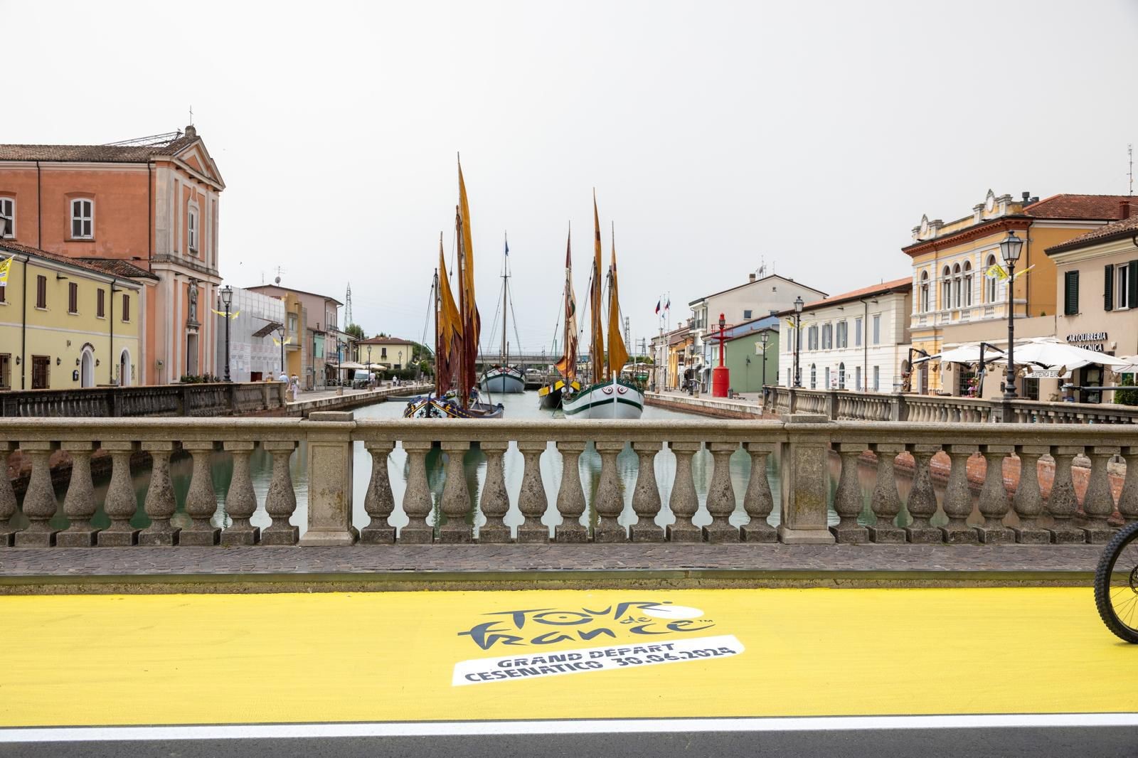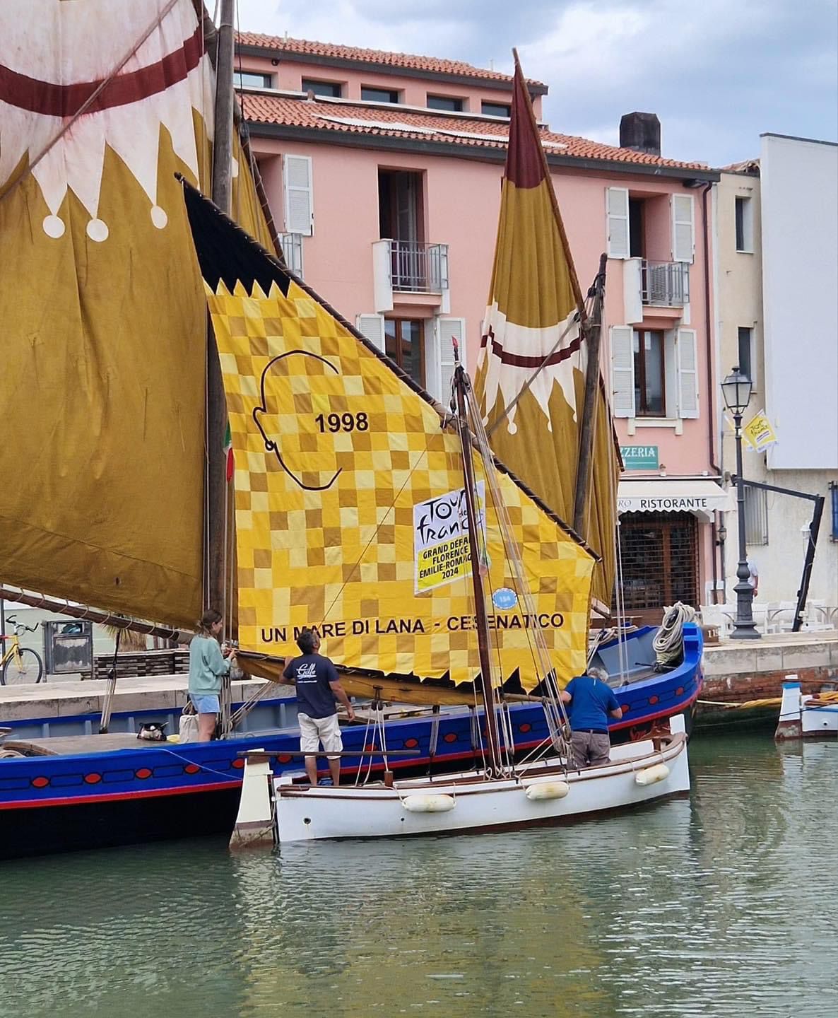 Tra le altre installazioni la vela gialla realizzata dall’Associazione “Un Mare di Lana” e issata sulla barca “Le tre fff” lungo il Portocanale, che va ad affiancare quella celebrativa di Pantani affissa sulla facciata del Municipio. Tinta “Giallo Tour” anche per la pista ciclabile di Via Mazzini e Via Saffi, con i loghi ufficiali di tappa a ricordare questo importante evento per la città.