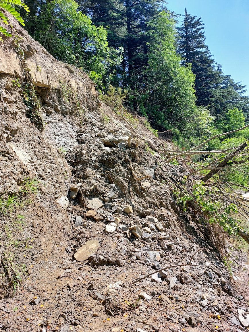 Una seconda frana si è attivata circa un chilometro più a valle, in corrispondenza del giardino comunale: anche qui il movimento franoso ha causato il crollo di coltre e blocchi di pietra, rendendolo impraticabile.