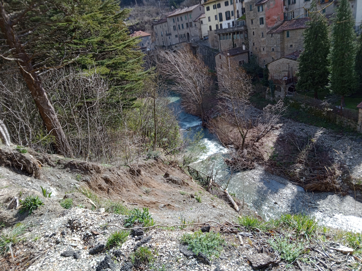 Qui nella zona in prossimità dell’area feste, vicino al centro storico, una frana nel pendio fra il fiume Rabbi e la soprastante strada provinciale SP3 ha danneggiato il muro adiacente all’alveo con il distacco di porzioni importanti di coltre e blocchi di pietra dal versante.