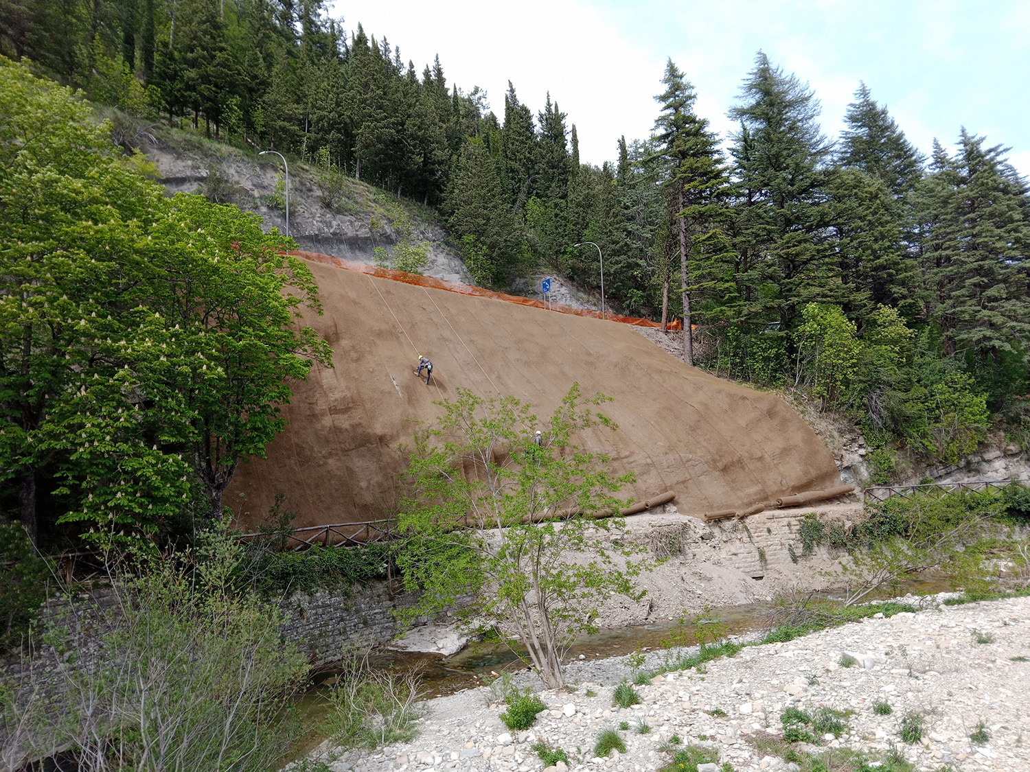In entrambi i tratti colpiti dal dissesto è previsto un rafforzamento corticale garantito dalla posa di reti e funi e ancoraggi. Tale intervento ha anche l’obiettivo di proteggere il pendio limitando l’evoluzione del dissesto e i processi di erosione e retrogressione.